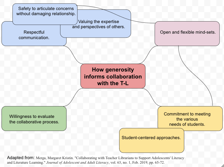 In my reflection on Module 7, I discussed how generosity is at the core of Margaret Merga’s 2019 list for what constitutes good collaboration. All other facets of good collaboration start with understanding and the desire to do what is best for others. While Merga’s article “Collaborating with Teacher Librarians to Support Adolescents’ Literacy and Literature Learning” looks at the relationship between teachers and teacher-librarians, the same concepts apply to the T-L collaborating with and guiding students. Similarly, the checklist from Empowered Teachers focuses on safety, comfort, lightheartedness, and love.